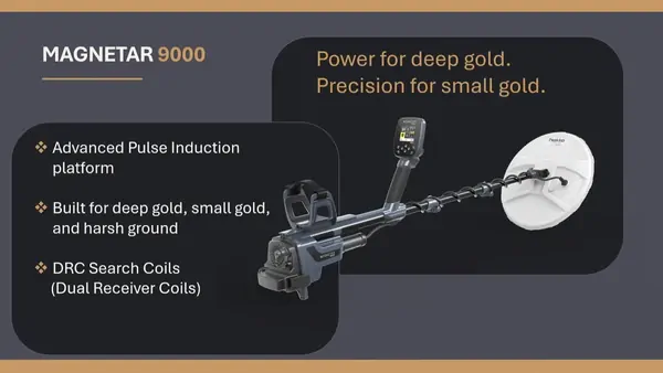 The Magnetar 9000 by Nokta is a modern pulse induction gold detector built for serious prospectors who search for both deep gold and small gold nuggets in highly mineralised ground. With its advanced pulse induction platform and dual-receiver coil system, the Magnetar 9000 delivers strong depth, fast target response, and stable performance in difficult field conditions. It is designed to give gold hunters the power to reach deeper targets while keeping the sensitivity needed for smaller pieces of gold. The Magnetar 9000 is built to perform in real search environments, whether you are working in dust, rain, wet ground, or shallow water. With IP68 protection, the detector is fully submersible up to 3 meters / 10 feet and sealed against dust for reliable field use.